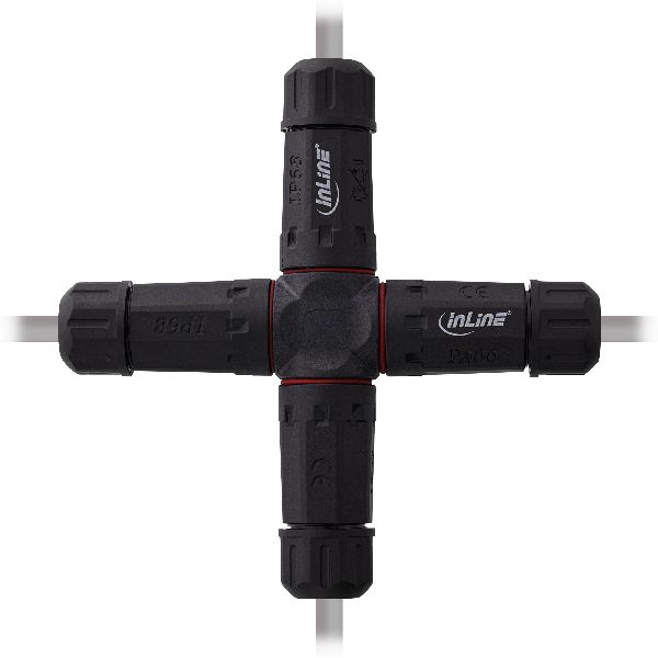 - Kreuzverteiler für Stromanschlüsse: Vierfache Verbindung für 3-adrige Kabel – ideal für strukturierte Stromverteilungen im Außenbereich oder in feuchten Räumen.