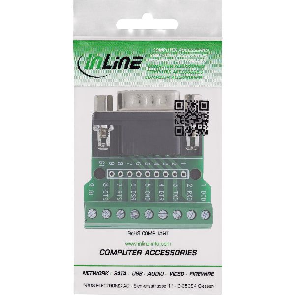 Der InLine® Terminalblock mit D?Sub 9 Stecker und Schraubklemmanschlüssen wurde für den professionellen Einsatz bei serieller Signalverdrahtung entwickelt. Die Schraubklemmen mit 3,96 mm Rastermaß ermöglichen den sicheren Anschluss von Einzeladern im Bereich 18–24 AWG. Die Betätigung erfolgt mithilfe eines handelsüblichen Schlitzschraubendrehers mit Klingenbreite ? 2 mm.