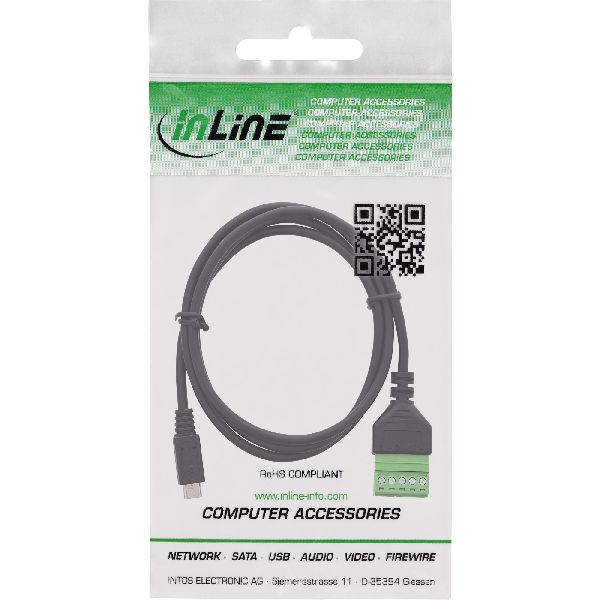 Der InLine® Micro USB 2.0 Terminalblock?Adapter mit 5?adrigem Anschlusskabel kombiniert die Vorteile einer steckfertigen USB-Verbindung mit der Flexibilität offener Signalverdrahtung. Der Micro-USB-Stecker ist direkt mit einer 5?poligen Schraubklemme verbunden – ideal für Prüfplätze, Diagnosegeräte, Embedded?Systeme oder Labore.