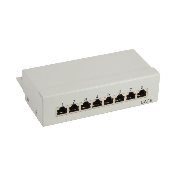 In diesem Desktop Patchfeld können bis zu 8 Verlegekabel über LSA Schneidklemmen angeschlossen werden. Das Patchfeld ist bis Cat. 6 ausgelegt und ist voll abgeschirmt. Die RJ45 Anschlüsse sind durchnummeriert.