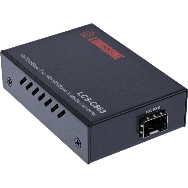 Der C863 ist eine von Longshines Antworten auf die Erweiterung bestehender Gigabit-Ethernet-Netzwerke. Die einfache Implementierung und Erweiterung von 1000BASE-TX/1000BASE-X-Netzwerken kann mit diesem Konverter weiter gewährleistet werden. Der Konverter ist im angeschlossenen Zustand völlig transparent, d.h. die Netzwerkleistung bleibt unverändert, nur dass mit dem angeschlossenen C863 das Netzwerk nun Kupfer- und Glasfaserkabel kombinieren kann. Zusätzliche Flexibilität ist mit einem SFP-Anschluss möglich. Zusätzliche Entfernungen sind mit der Single-Mode-Version möglich, die bis zu 80 km Konnektivität pro übertragenem Segment bietet (abhängig vom SFP-Modul). Der C863 ermöglicht die Installation von Glasfaserkabeln an jeder beliebigen Stelle innerhalb einer Fast-Ethernet-Netztopologie, indem er direkt an vorhandene Geräte angeschlossen wird. Sein kompaktes, modulares Design erleichtert den Einsatz auf einem schmalen Schreibtisch, um Platz zu sparen.