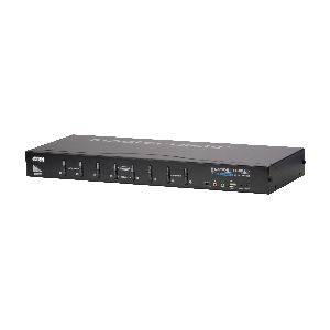 USB-KVM-Switch mit 8 Ports für DVI-Grafik. Der USB-KVM-Switch mit 8 Ports für DVI-Grafik CS1768 ist ein Multifunktionsgerät, das es ermöglicht, 8 Computer von einer einzigen USB-Tastatur, Monitor (DVI-I und VGA) und USB-Maus aus zu steuern. Er kann auf maximal drei Ebenen kaskadiert werden - dadurch ist eine Kaskadenschaltung von maximal 73 CS1768s-Einheiten möglich - dies ergibt bis zu 512 Computer - die alle von einer einzigen Konsole aus gesteuert werden können - ideale Voraussetzungen für die Verwaltung von IT-Anwendungen auf industrieller Ebene. Weiterhin unterstützt der CS1768 die Multiview-Konfiguration, durch die bis zu vier Switches über herkömmliche USB-Kabel verbunden werden können, um auf Mehrschirmcomputern übersichtlich die gesamte Konfiguration im Griff haben zu können. So können Sie die Bildausgabe bequem gegenüberstellen, analysieren und übersichtlich überwachen, wodurch sich der gesamte Arbeitsablauf vereinfacht. Ferner besitzt der CS1768 die von ATEN bekannte OSD-Menüsteuerung, über die der Zugriff auf jeden der angeschlossenen Computer möglich ist. Über das OSD-Menü lässt sich auch die Gerätekonfiguration sichern und bei Bedarf zurückspielen. Der CS1768 unterstützt Multimediatastaturen und die Tonübertragung. Die Toneingabe kann über zwei Mikrofone, eins für jeden Computer, erfolgen. Sie können sich die Tonwiedergabe der einzelnen Computer auf zwei Lautsprechersets anhören (jeweils ein Wiedergabesignal gleichzeitig).