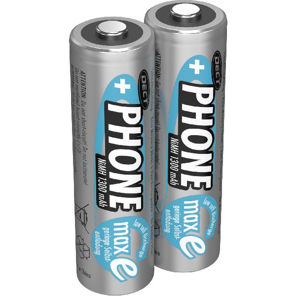 Super Power NiMH-Akku mit 1300mAh! Im 2er Blister. NiMH-Akkus sind überall einsetzbar, wo Einwegbatterien zu hohe Kosten verursachen, die Umwelt zusätzlich belasten und nur eine unzureichende Leistung/Ausdauer zur Verfügung stellen. NiMH-Akkus lassen sich idealer Weise in elektronischen Kleingeräten wie Discman, Phonogeräten, Taschenlampen, Fernbedienungen usw. einsetzen. Die "Phone DECT" Reihe ist speziell für Mobile Haustelefone gedacht.