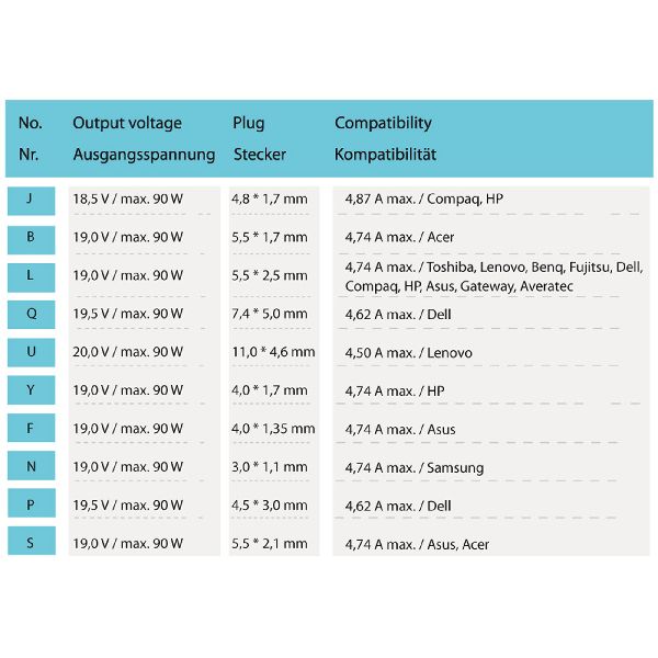 Stecker-Nr. | Ausgangsspannung | Stecker-Größe | Kompatible Notebooks |