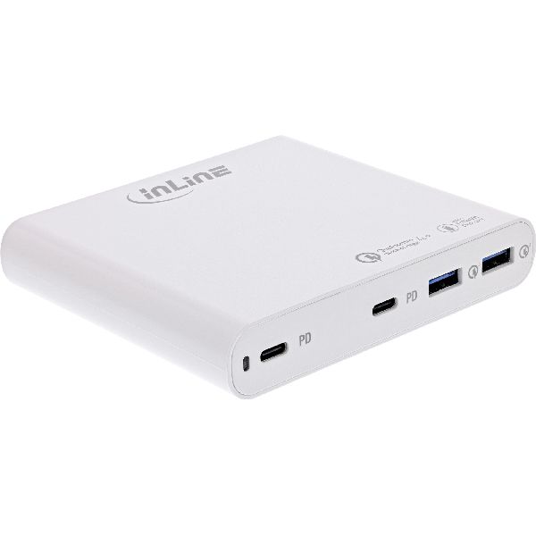 Mit dem InLine® GaN-Ladegerät stehen Ihnen gleich vier leistungsstarke Anschlüsse in einem kompakten und effizienten Gehäuse zur Verfügung. Zwei USB-C- sowie zwei USB-A-Ports liefern eine Gesamtleistung von bis zu 120 W und ermöglichen das gleichzeitige Laden von Smartphones, Tablets, Laptops oder Zubehör.