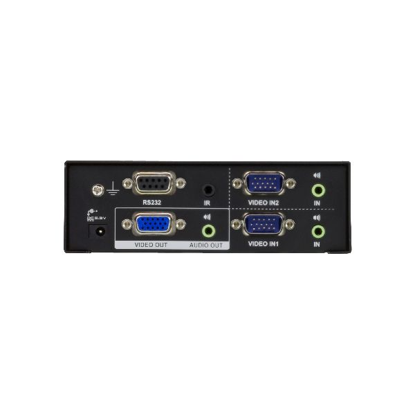- Anschlüsse: Eingang Grafik: 2x HD-15 Stecker (blau), Audio: 2 x 3,5mm Stereo-Buchsen (grün) / Ausgang Grafik: 1x HD-15 Buchse (blau), Audio: 1x 3,5mm Stereo-Buchse (grün) / RS-232-Port: 1x DB-9 Buchse (schwarz) / Infrarot-Eingang: 1x 3,5mm-Buchse (schwarz) / Stromversorgung: 1x Stromeingangsbuchse