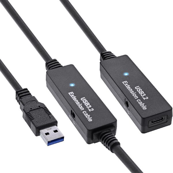 Das leistungsstarke aktive USB 3.2 Gen.1 Verlängerungskabel von InLine ist die ideale Lösung, um USB-Ports von unzugänglichen Stellen an die gewünschte Position zu verlegen. Dabei können durch die integrierte Elektronik lange Distanzen von bis zu 15 Metern verlust- und störungsfrei überbrückt werden. Die USB-Verlängerung findet Anwendung bei Festplatten, Drucker, Webcams, Headsets, Mäusen, Tastaturen und anderen USB-Geräten. Die Datentransferrate von bis zu 5 Gb/s ermöglicht Ihnen eine blitzschnelle und zuverlässige Datenübertragung. Für Verlängerungen ab 10 Metern und länger empfehlen wir die Verwendung des mitgelieferten Steckernetzteils.