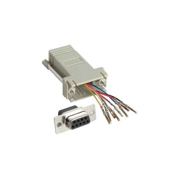 Dieser Adapter besteht aus einem Kunststoffgehäuse mit einer RJ45 Buchse und einer SubD Buchse. Die Pins für die SubD Buchse sind nicht fixiert und können frei belegt werden.