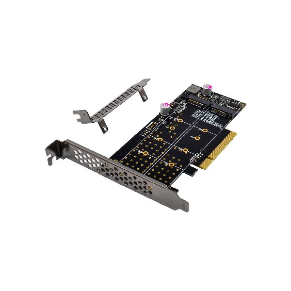 Mit einer PCIe 3.0 x8 Schnittstelle bietet die Karte eine maximale Bandbreite von bis zu 64 Gb/s, wobei jeder M.2-Slot eine Datenrate von bis zu 4 GB/s unterstützt. LED-Indikatoren für Lese- und Schreibaktivitäten erleichtern die Überwachung des Betriebsstatus.