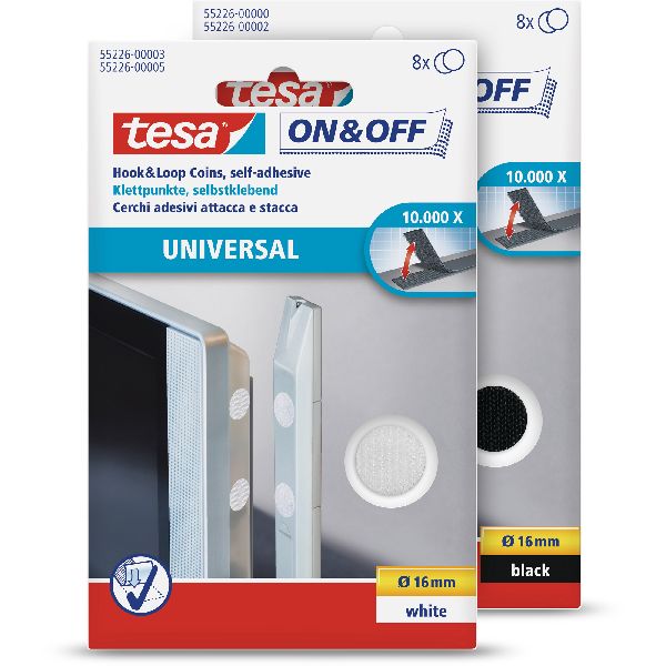 Die selbstklebenden tesa-On- & Off-Klettpunkte zum Aufkleben vereinen die bewährte tesa-Klebequalität mit einer innovativen Kletttechnologie. Dadurch sind die Klettpads in der Lage, leichten Gegenständen und Textilien einen sicheren Halt zu geben. Die Klettpunkte sind im Haushalt, im Büro oder in der Hobbywerkstatt einsetzbar und eignen sich z.B. zum Befestigen von Fernbedienungen oder zum Fixieren von Schreibutensilien. Die Klettpads lassen sich bis zu 10.000 mal öffnen und schließen und sind daher für einen langfristigen Einsatz geeignet. Unser Tipp: Damit die Klebeflächen der Klettpunkte ihre maximale Klebeleistung entfalten können, müssen Untergrund und Objekt staub-, fett- und schmutzfrei sein.