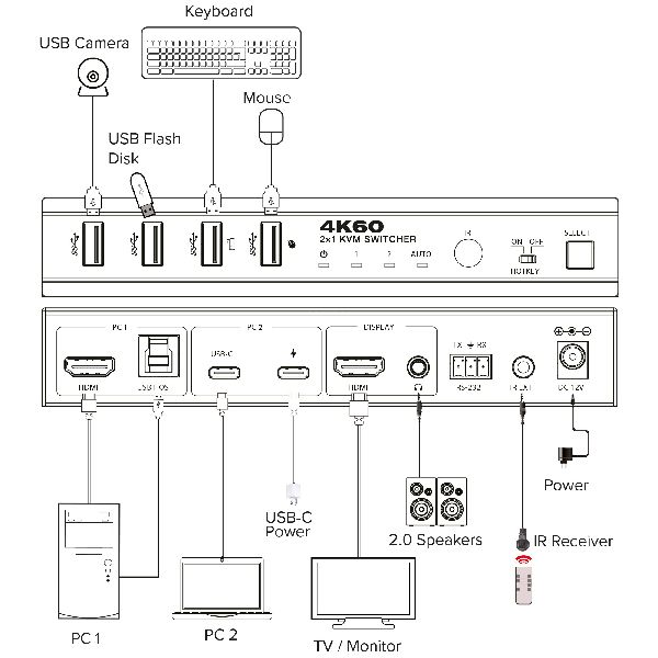 Die Umschaltung erfolgt flexibel über Fronttaste, IR-Fernbedienung, Hotkeys oder per RS-232-Schnittstelle – ideal auch für professionelle IT-Setups oder automatisierte Anwendungen. Der Switch ist vollständig treiberlos und sofort einsetzbar unter Windows, macOS oder Linux.