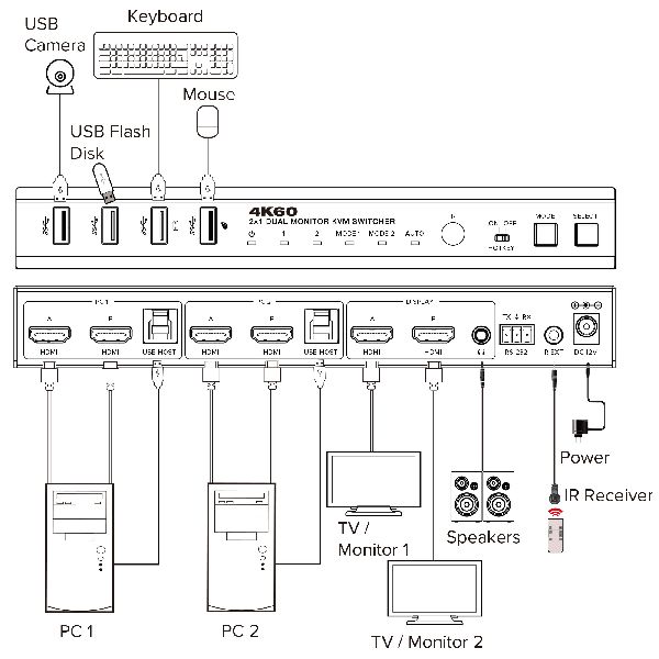 - Effiziente Steuerung zweier PCs mit Dual-Monitor-Setup: Bedienen Sie zwei Computer gleichzeitig über zwei HDMI-Monitore und eine gemeinsame USB-Peripherie.
