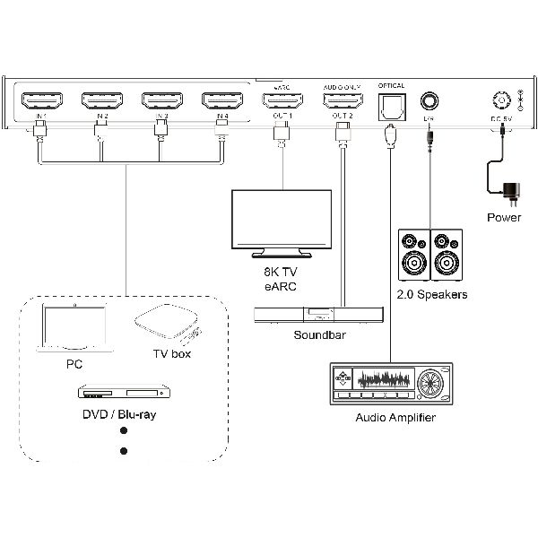 Ein besonderes Highlight ist die Audioauskopplung: Neben HDMI Audio only bietet das Gerät auch Ausgänge für optisches SPDIF und analoge Stereoausgabe über 3,5 mm Klinke. So lassen sich sowohl moderne AV-Receiver als auch klassische Soundsysteme problemlos anbinden. Die Steuerung erfolgt bequem per mitgelieferter IR-Fernbedienung oder direkt über das Tastenfeld am Gerät.