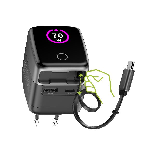 Mit zwei leistungsfähigen USB-C-Anschlüssen mit Power Delivery (PD) und einem zusätzlichen USB-A-Anschluss mit Quick Charge (QC) lassen sich nahezu alle mobilen Geräte – vom Smartphone bis zum Notebook – gleichzeitig und schnell aufladen. Das integrierte, 60 cm lange USB-C-Kabel lässt sich bei Bedarf ausziehen und wieder sauber einrollen, was das Netzteil besonders für mobile Arbeitsplätze und Techniker im Außendienst attraktiv macht.