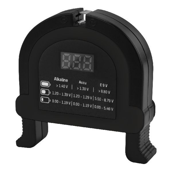 Er eignet sich zum Test von 1,5V Alkaline Batterien und 1,2V NiMH Akkus in den Größen Micro AAA, Mignon AA, Baby C, Mono D sowie für 9V Blocks E.
