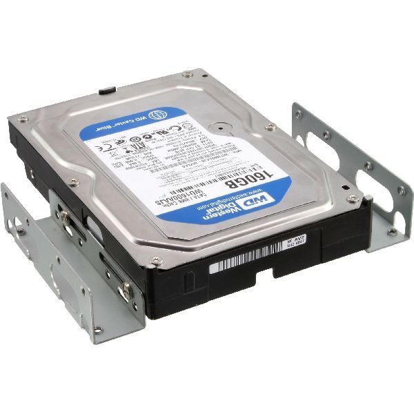 HDD Einbauschienen zum Einbau einer 8,89cm (3,5") Festplatte in einen 13,34cm (5,25") Schacht, 2 Metallschienen mit Schrauben. Die Winkel werden einfach an die Festplatte in die vorhandenen Gewinde geschraubt und in einen freien 13,34cm (5,25") Schacht des PC-Gehäuse eingebaut.