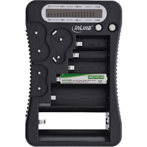 Mit dem InLine Batterietester behalten Sie den Überblick über den Ladezustand Ihrer Batterien und Akkus. Über 12 verschiedene Formate lassen sich mit nur einem Gerät überprüfen, darunter Standardgrößen wie AA, AAA, C, D und 9V sowie Spezialformate wie CR123A, CR-V3, 2CR5 und verschiedene Knopfzellen. Der Tester zeigt die verbleibende Kapazität auf einer gut lesbaren LCD-Anzeige an. Diese gliedert sich in drei Bereiche mit insgesamt 18 Segmenten: von gering bis gut - eine schnelle Einschätzung ist jederzeit möglich.
