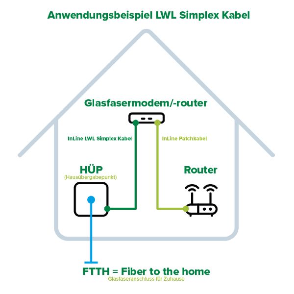 Telekommunikationsunternehmen wie Vodafone, Deutsche Glasfaser und Telekom ermöglichen zunehmend Glasfaseranschlüsse für private Haushalte in Deutschland. Fiber to the home (FTTH) Kabel von InLine verbinden dabei den Hausübergabepunkt (HÜP) mit dem Glasfasermodem und sorgen für einen zuverlässigen Glasfaseranschluss in ihrem Zuhause.
