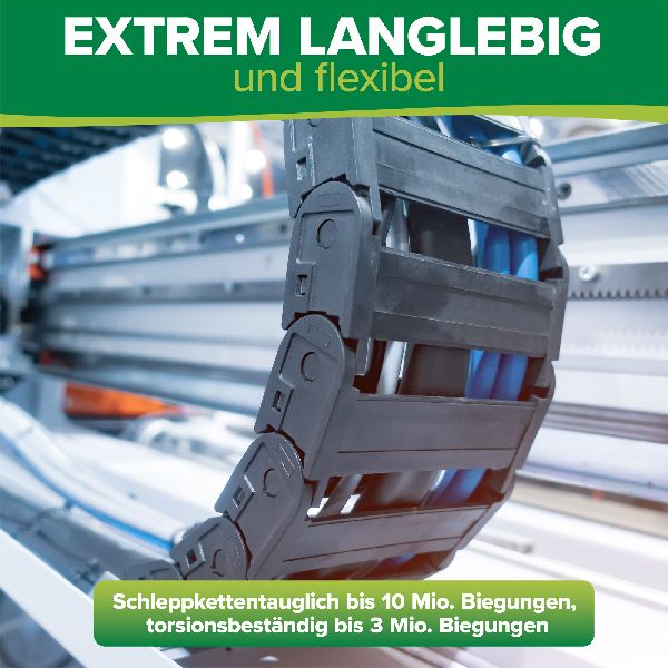 - Extrem langlebig und flexibel: Schleppkettentauglich bis 10 Mio. Biegungen, torsionsbeständig bis 3 Mio. Biegungen