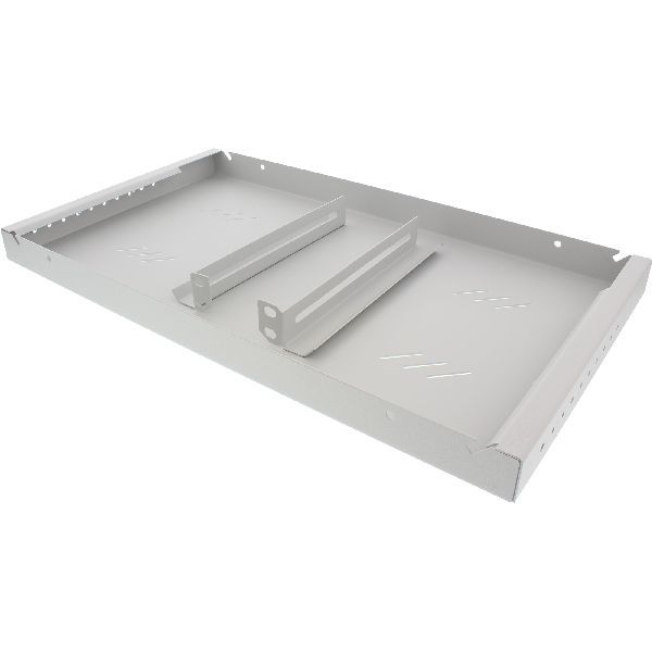 19"-Schrankregal zur Schaffung einer Basis für alle Geräte wie Konverter, Routern, NAS, USB-Festplatten und andere Geräte, die nicht direkt auf dem 19“-Schrank montiert werden können. Die Halterungen sind an der Unterseite des Regals angeformt und lassen sich separat montieren.