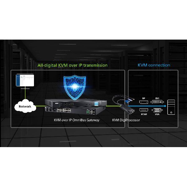 Der KG1900T USB VGA KVM DigiProcessor kann eine zentrale Verbindung zwischen dem KVM over IP OmniBus Gateway und dem Zielcomputer herstellen. Sein digitales Signal liefert einen hervorragenden Signalausgleich für eine stark verbesserte Videoqualität bis zu 1920 x 1200 @ 60 Hz, 24-Bit-Farbtiefe und steigert die Datenübertragungsrate schneller als herkömmliche KVM-Lösungen. Dieser Plug and Play KVM DigiProzessor ist mit einem leistungsstarken SoC ausgestattet, der eine hervorragende Videokomprimierungsleistung bietet. Sein Zero-U- und leichtes Design ermöglicht eine effiziente und saubere Installation und stellt eine ideale platzsparende Lösung dar. Der KVM DigiProcessor eignet sich perfekt für Anwendungen in Rechenzentren, Serverräumen, Steuerungen und High-Tech-Produktionslinien.