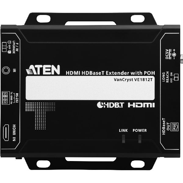Der VE1812T verfügt über Power over HDBaseT (POH), was Strom von Tx zu Rx über Cat 5e/6/6a Kabel ohne zusätzliche Stromversorgung sendet. Der VE1812T unterstützt RS-232- und IR-Signalübergabe, so dass Sie das HDMI-Quellgerät vom Empfängergerät (VE1812R) aus steuern können und gleichzeitig auf das HDMI-Displaygerät vom Sendegerät (VE1812T) aus zugreifen können. Die IR-Signale können auch in beide Richtungen erweitert werden. br> br>Der VE1812T HDMI HDBaseT Sender mit POH ist HDMI (3D, Deep Color, 4kx2k) und HDCP kompatibel. Bei der Übertragung von HDMI/4K mit einem Cat 6a oder ATEN 2L-2910 Cat 6 Kabel kann die maximale Distanz bis zu 100 Meter erreichen. Im Lange Reichweite Modus kann der VE1812T ein HDMI Signal bis zu 150 m bei 1080p erweitern. Der VE1812T eignet sich hervorragend für digitale Klassenzimmer, Videokonferenzräume, Spiele oder jede Installation, die eine überlegene Videoqualität erfordert.