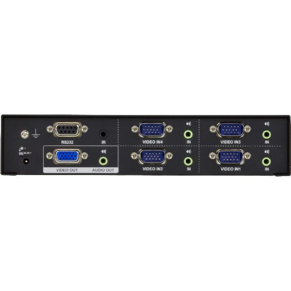 - Anschlüsse: Eingang Grafik: 4x HD-15 Stecker (blau), Audio: 4x 3,5mm Stereo-Buchsen (grün) / Ausgang Grafik: 1x HD-15 Buchse (blau), Audio: 1x 3,5mm Stereo-Buchse (grün) / RS-232-Port: 1x DB-9 Buchse (schwarz) / Infrarot-Eingang: 1x 3,5mm-Buchse (schwarz) / Stromversorgung: 1x Stromeingangsbuchse