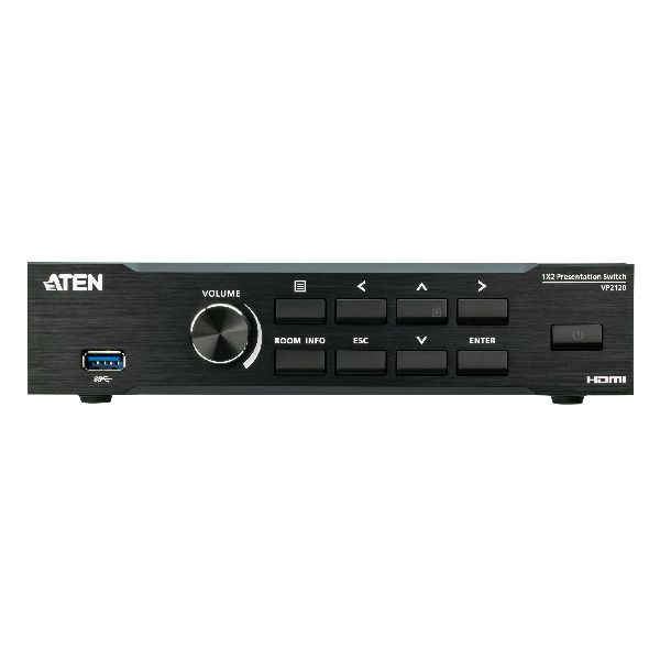 Der ATEN VP2120 Seamless Presentation Switch integriert Video Matrix Switch, AV-Streaming, Audiomischung und kollaborative Funktionen in einem kompakten Gerät.