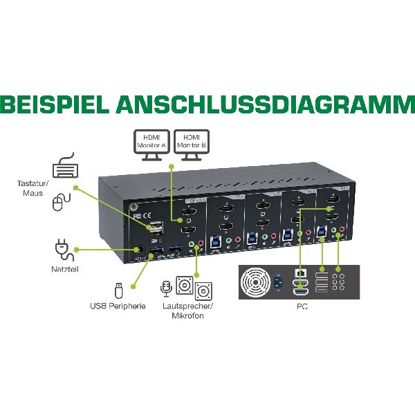 Der InLine KVM Desktop Switch wurde speziell für die Nutzung von zwei Monitoren (2x HDMI 2.0) an vier Multimedia-Computern entwickelt. Mit dem InLine KVM Desktop Switch können Sie vier PCs mit nur einer USB-Tastatur, Maus sowie zwei Monitoren vollständig steuern. Dieser Dual-Monitor-HDMI-KVM-Switch unterstützt Auflösungen bis 3840x2160 (4K) bei 60Hz, für maximalen Komfort bei der Anpassung an Ihre Bildschirmanforderungen.