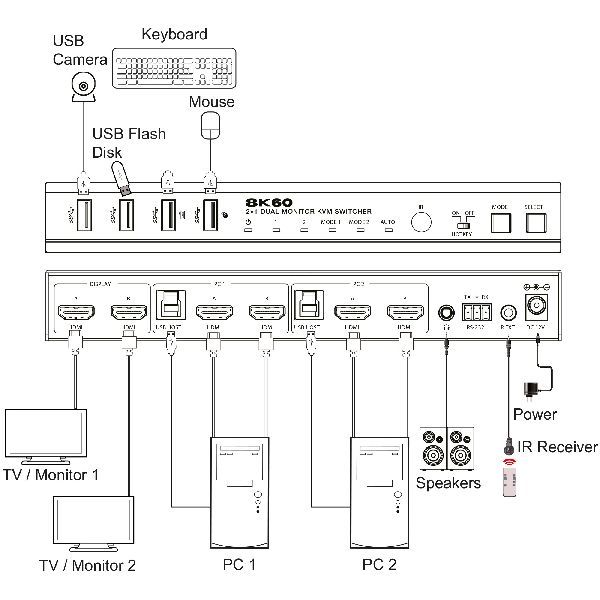 - Flexible Umschaltung ohne Verzögerung: Schneller Wechsel zwischen zwei PCs per Hotkey, Taste, IR-Fernbedienung oder RS-232 – ohne Umstecken von Kabeln.