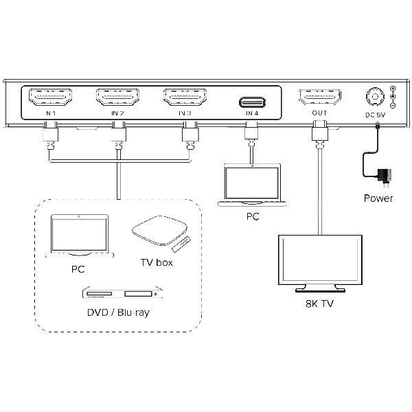 - 1 × InLine® HDMI Switch, 4-fach, 48Gb/s, 8K@60Hz, mit USB-C