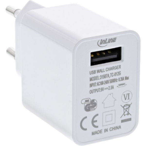Produktinformationen "InLine® USB Ladegerät Single, Netzteil, 100-240V zu 5V/2,5A, weiß 31507A"