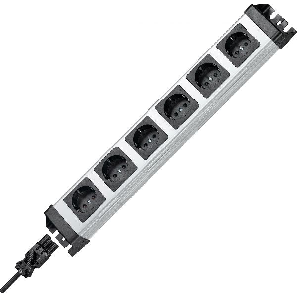POWERversal 6-fach, Eingang-/Ausgang Schnellstecksystem, kaskadierbar, 90° gedrehten Töpfen, 65mm Topfabstand, anschraubbar, wiederanschließbar, Steckdosenleiste, 250V~, 16A, max. 3600W, Schutzart IP20, Farbe: silber-schwarz