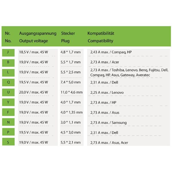 | L | 19,0 V / max. 45 W | 5,5 x 2,5 mm | 2,73 A max. / Toshiba, Lenovo, BenQ, Fujitsu, Dell, Compaq, HP, Asus, Gateway, Averatec |